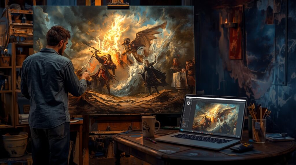 - Combine physical paint with digital compositions for hybrid works.